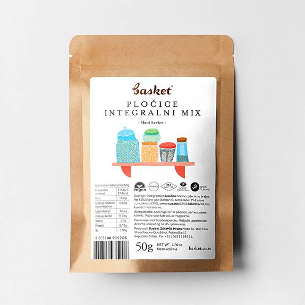 Integralni znači bogat integralnim brašnom. Miks znači susam, lan, suncokret, kikiriki, kim. Pločice su standardno hrskave, samo malo veće